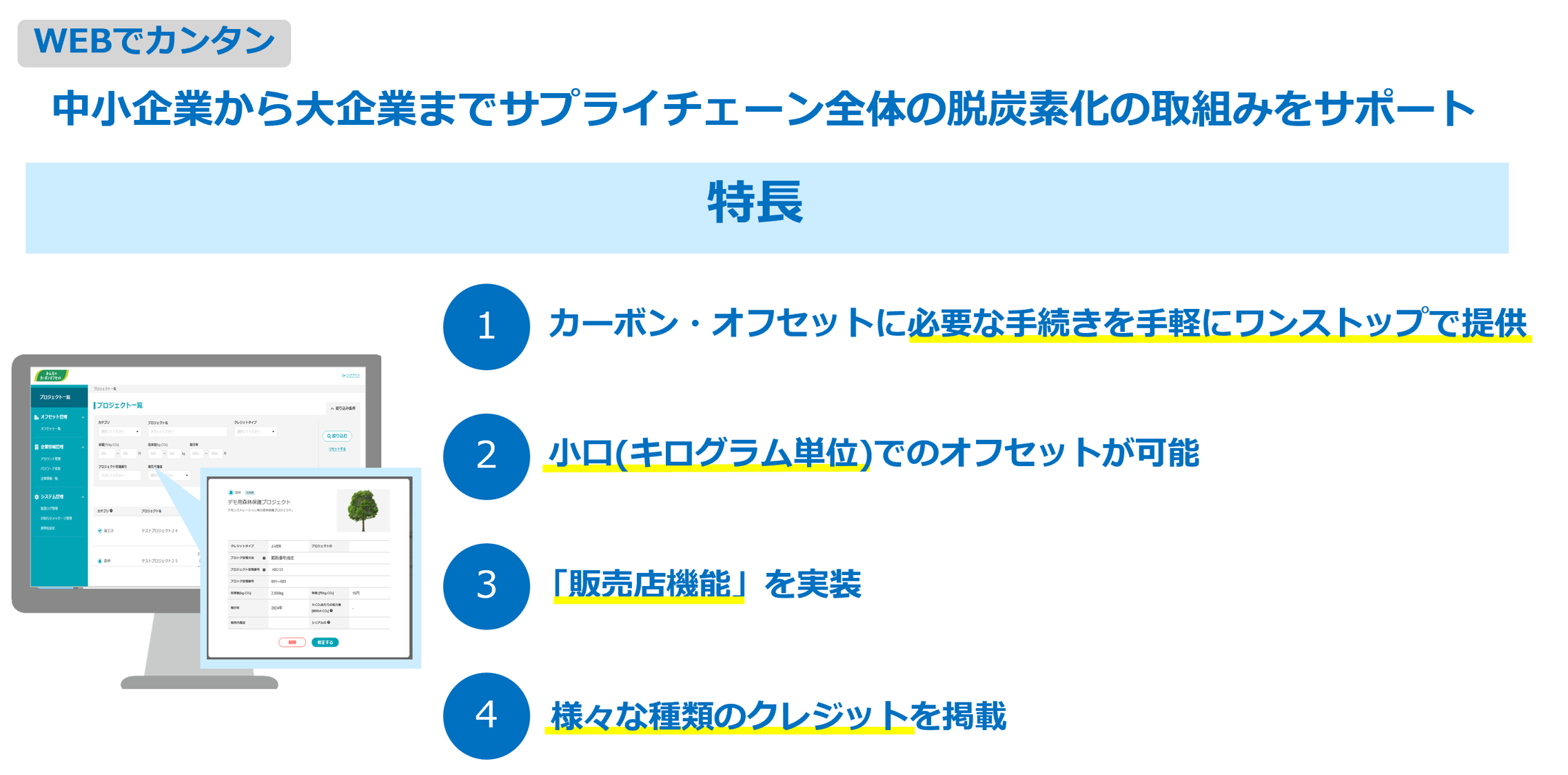 ①カーボン・オフセットに必要な手続きを手軽にワンストップで提供: Webサイトから希望のクレジットを選択してオフセットすることができます。通常2~4週間かかる開始手続きが数日で完了し、オフセット証書の取得までWeb上で行えます。サービス運営は、プライム上場250社以上と取引のある株式会社ウェイストボックス(以下 ウェイストボックス)と共同で行っており、安心の品質とサポート体制によりサービスを提供します。